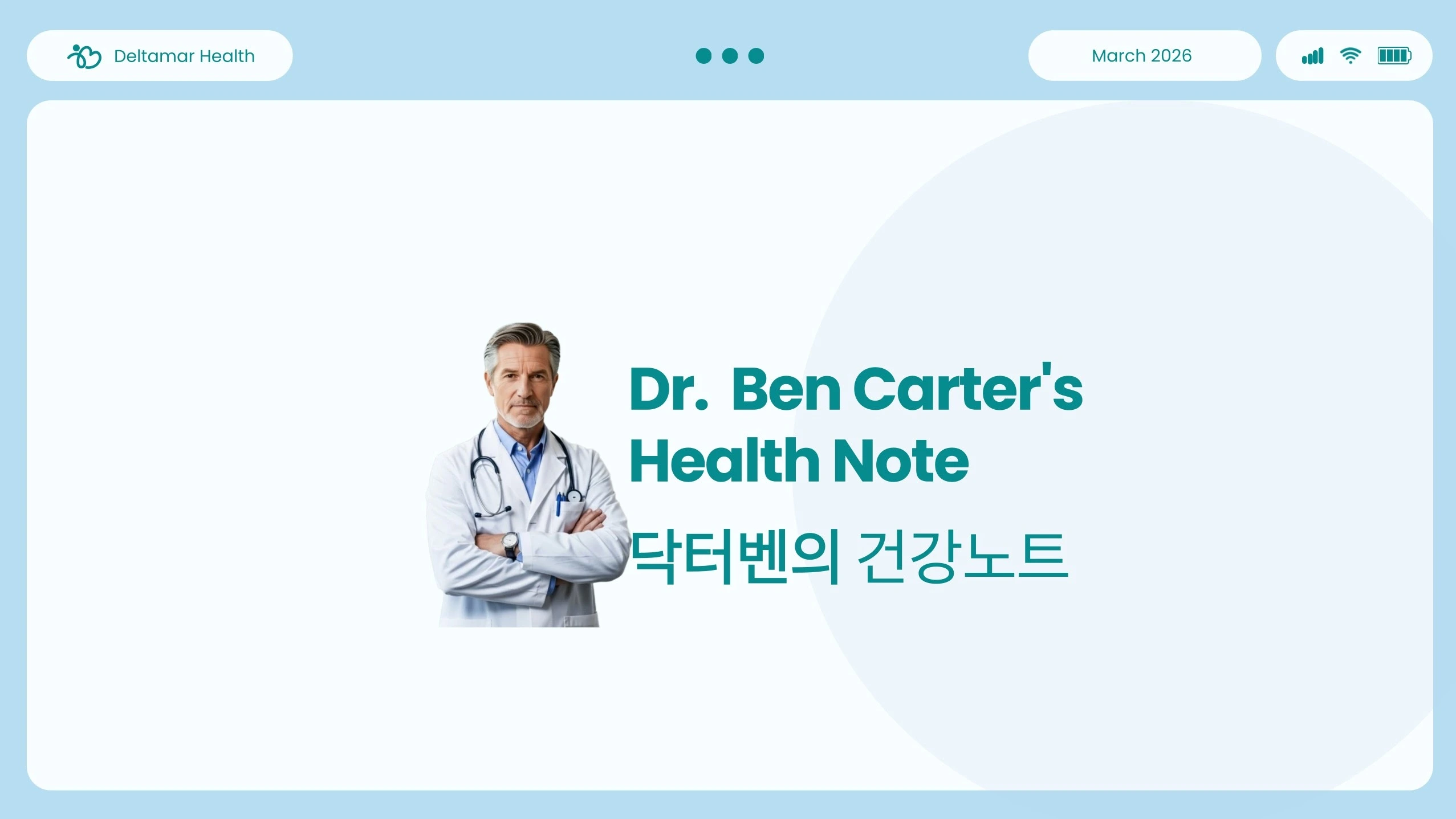 👋 안녕하세요. 저는 닥터 벤 카터(Dr. Ben Carter) 입니다. 40년 넘게 내과 의사로 일하며, 수많은 어르신 환자분들을 만나왔습니다. 그분들을 통해 한 가지 진리를 깨달았습니다. 🩺 “건강은 약이 아니라, 생활 속의 선택에서 만들어집니다.” 이 채널 **〈닥터벤의 건강노트〉**에서는 단순한 습관 교정뿐 아니라, 음식·운동·수면·스트레스 관리 등 삶 전체를 다루는 실천형 생활의학 콘텐츠를 전합니다. 💡 주요 콘텐츠 혈류·혈관을 되살리는 식단과 음식 조합 심장·뇌졸중 예방 생활 루틴 어지럼증, 수면, 관절, 손발 냉증 관리 면역력·소화·노화 예방에 관한 실용 의학정보 한국 시니어 세대 맞춤 “생활 속 의학 해설” 모든 콘텐츠는 의학적 근거와 실제 환자 사례를 기반으로 하며, 일부 영상은 AI 음성·영상 기술을 활용해 제작됩니다. ⚙️ 운영 원칙 및 의학적 면책 후원·유료 서비스·제품 판매를 하지 않습니다. 모든 영상은 공익적 목적의 건강정보 제공을