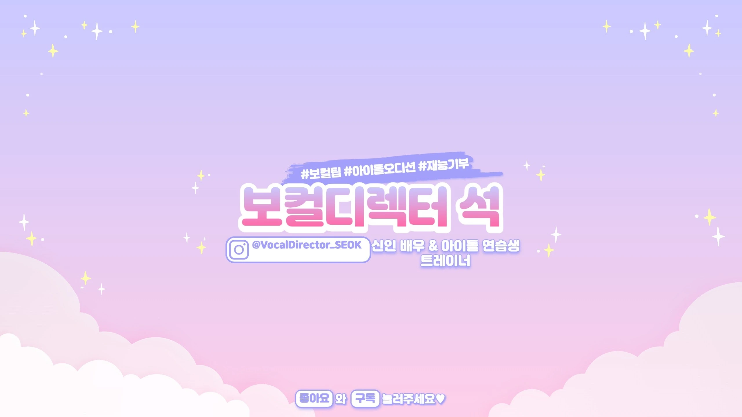 누구나 참여 가능한 무료 오디션 , 현직 프로들의 특강을 개최하고 있습니다. 비용은 대부분 무료이고, 부득이할 경우 최소한의 비용만 받고 있습니다. . . ⭐️현 직업 → 신인 배우 & 아이돌 연습생 보컬 트레이너 ⭐️강남구 삼성동에 1:1 보컬 스튜디오 운영 중 (유료 레슨) . ⭐️합격생 및 연습생 배출 하이브, SM, JYP, 플레디스, FNC, 위에화, MNH, 피네이션 외 다수 . 자세한 커리어가 궁금하다면? 👇 https://blog.naver.com/vocaltraining
