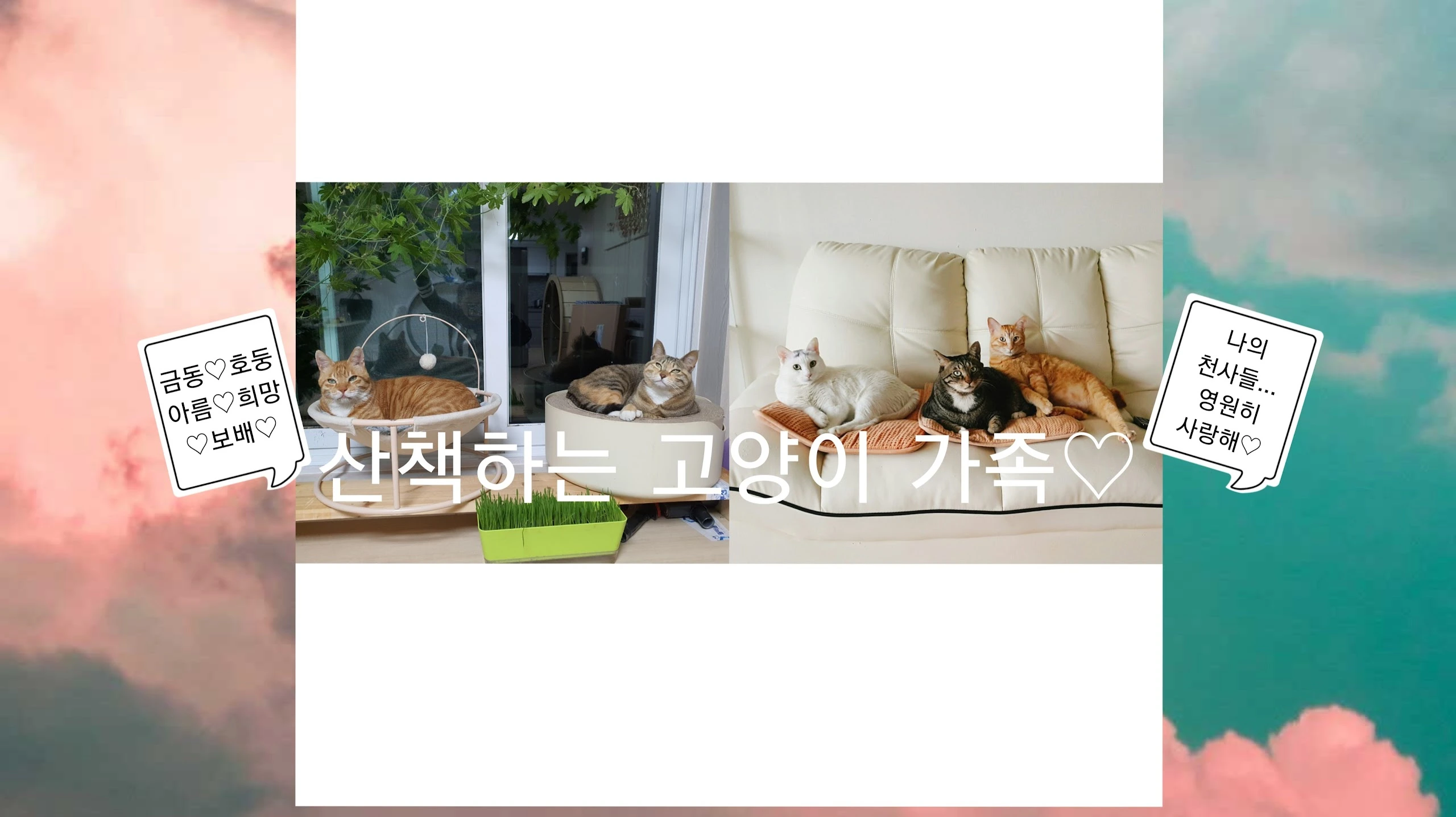 우선 간단하게만 울 아가들 입양 사연 올려 봅니다^^ 😊 호둥이 영상 저장소로 유튜브를 하게 되었는데~ 어찌어찌 하다보니 여기까지 왔네요ㅎㅎ😊 우리집 고양이들은 모두 길고양이였어요~ 입양된 순서로 따지면~ ❤호둥이 16살/남 :어미잃고 쓰레기통 뒤지던 아기냥이 💚아름이 13살/여 :엄마가 터키쉬앙고라 유기묘였고 유기묘가 낳은 아기냥이중 한마리 💛희망이 11살/남 :슈퍼마켓에 밥먹으로 오는 길냥이 낳은 아기 💙금동이 19살/남 :구내염이 너무 심해 밥도 잘 못먹던 성묘 길냥이 🧡보배 9살/여 :유난히 저를 따라다니던 길냥이 💜단풍 5살/여 : 어미잃은 아기냥이를 동네 아이들이 박스에 넣어 다니다 버림 💗애교 4살/여 :아파트 미로 같은 하수구에 갇혀 3개월동안 핫팩.밥.물을 맨홀 뚜겅열고 공급하며 구조 💙수호(시도에서 개명) 12살/남 :아픈 성묘 길냥이 제 채널 재생목록 중(어느 길고양이의 인생 이야기)라는 재생목록에 모든 과정이 영상으로 소개