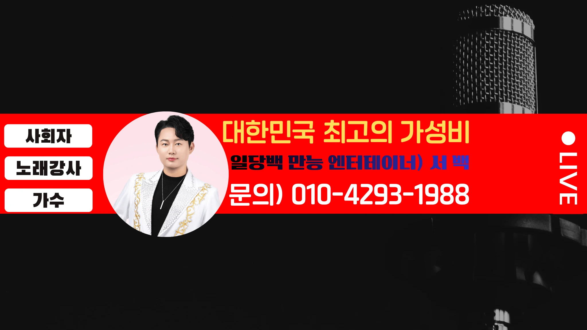 🎤 서백TV – 대한민국을 대표하는 MC & 가수 & 노래강사 ✨ “사회와 노래, 그리고 감동의 순간까지 완벽하게”서백TV는 13년 이상 전국 무대에서 활약하며 사회·축가·가창·강의를 모두 소화하는 대한민국 최고의 올라운더 엔터테이너, MC 서백의 공식 채널입니다. 🌟 서백의 경쟁력 ✔️ 올인원 MC결혼식·돌잔치·기업행사·송년회·축제까지, 사회와 노래를 동시에 책임집니다.따로 초대가수, 따로 사회자를 부를 필요 없이 한 명으로 모든 걸 해결! ✔️ 13년 경력의 노하우수천 회 현장에서 다져진 감각으로, 어떤 무대든 완벽하게 분위기를 이끌어갑니다. ✔️ 전 연령대 맞춤 진행20대 신랑·신부의 결혼식부터, 60~80대 어머님들의 노래교실까지.세대를 초월한 소통과 맞춤형 멘트로 행사의 품격을 한 단계 업그레이드합니다. ✔️ 무대 장악력웃음과 감동, 추억과 열정을 동시에!“분위기를 미친 듯이 살려주는 사회자”라는 찬사를 받는 이유가 있습니다. ✔️ 사전 미팅 필수행사의 목적, 분위기,
