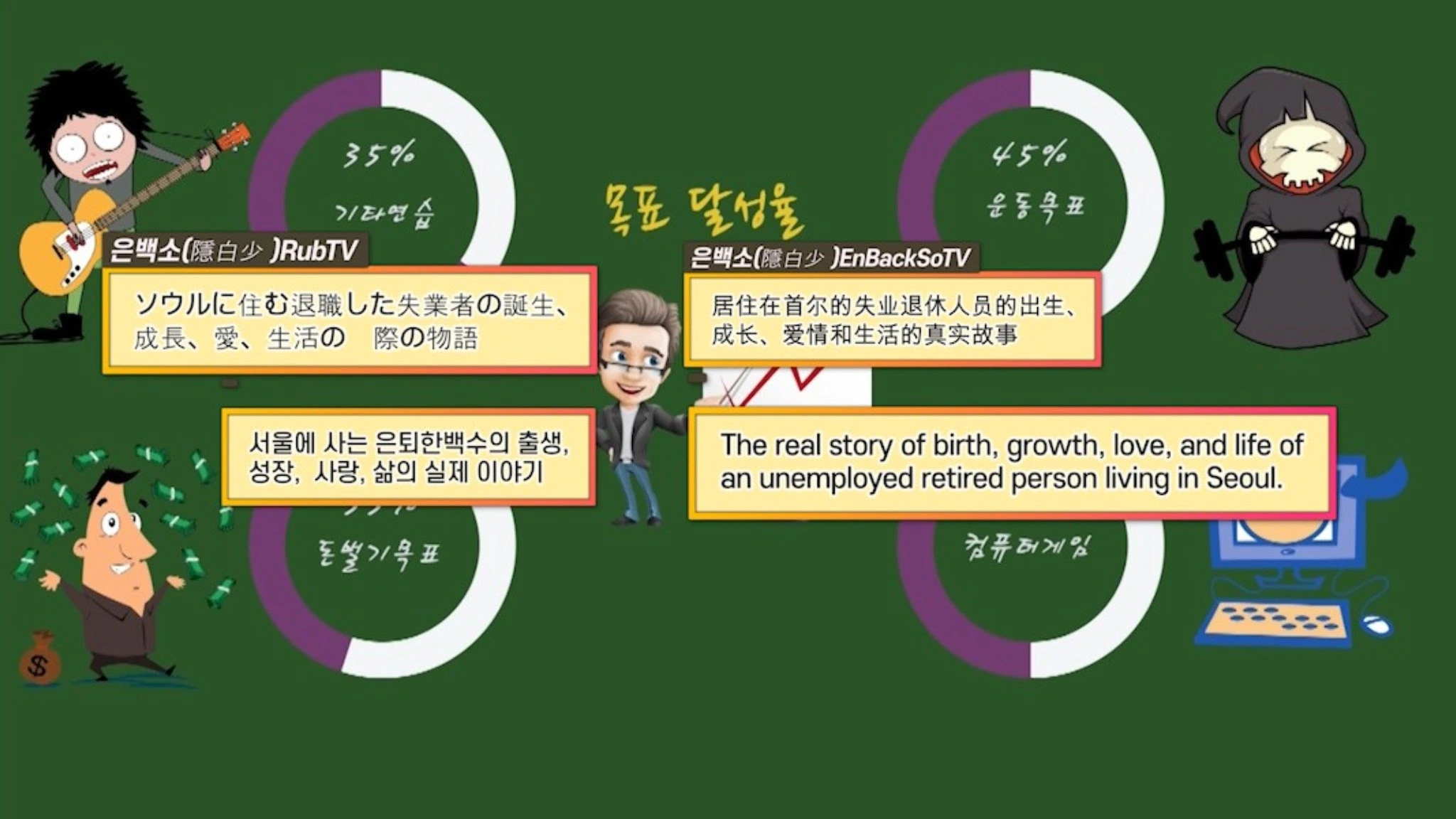 대한민국 서울에 살고 은퇴한 백수이지만, 아직 까지 소년의 마음 가지는 있는 평범한 사람의 인생 이야기. 주요 내용은 내가 말하고 싶고, 지난 삶의 이야기 입니다. (은백소극장) The story of a retired unemployed man who is still a boy in his heart and lives in Seoul, South Korea. The main content is the story I want to tell and the story of my past life. まだ心は少年で、大韓民国ソウルに住んでいる引退したニートの話。主な内容は私が言いたい話と私の過去の人生の物語です。 到现在为止内心还是少年,生活在韩国首尔的退休无业游民的故事。 主要内容是我想讲的故事和我前世的故事。