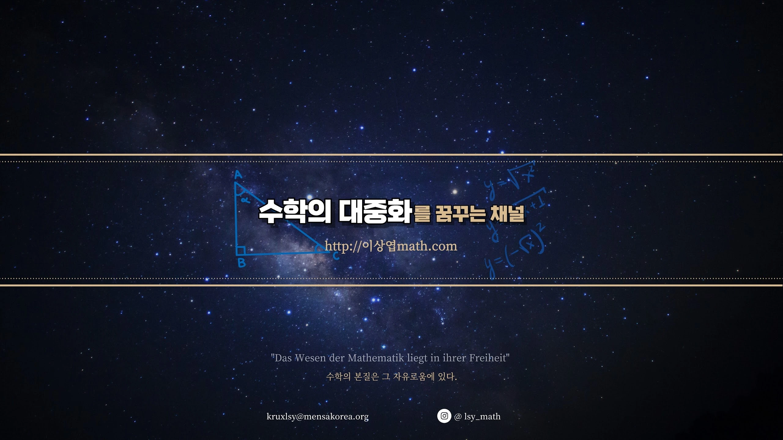 "수학의 대중화를 꿈꿉니다." 제가 영상을 기획하고 찍어 올리는 이유는, 대중의 기초 학문으로서 수학이 그동안 각종 자격증과 시험들의 한 과목 정도의 역할로만 비춰짐으로 인해 그 본질과는 너무나도 다른 왜곡된 인식이 퍼져 많은 이들의 마음에서 수학이 멀어지고 기피대상마저 되어버린 현 세태에 안타까움을 느껴서 입니다. 궁극의 지적 유희인 수학 본연의 모습. 그 어떤 오락 수단으로도 대체 불가능한 끝 없는 즐거움과 아름다움을 지닌 수학의 참 모습을 많은 분들께서 느끼실 수 있도록 돕고, 부정적으로 왜곡되어 있는 현재의 수학에 대한 인식이 본연의 모습으로 올바르게 변화되길 소망하고 있습니다. 그리하여 많은 이들의 마음에 수학이 편하게 자리잡고, 각지에서 많은 취미, 프로 수학자들이 양성되고, 더 나아가 장차 우리나라의 수학력도 올바르게 성장하기 위한 한 알의 씨앗이 되어보고자 합니다. 한 없이 모자라고 부족한 저 이지만, 누군가는 반드시 해야 할 일이라고 생각하기에 사명감을 갖고 최선을 다하여 노력 또 노력하려 합니다. 함께 해주시고 응원해주세요. 감사합니다 ^^ - 2018년 11월 중순 무렵에. 이상엽 영상에 대한 다양한 조언과 강연 및 비즈니스 문의는 [email protected] 으로 주세요. 언제든 환영합니다 ^^ (개인적인 질문, 숙제 등의 메일에는 답신드리지 않습니다.) 후원 | 우리은행 1002-031-127166 (이상엽)